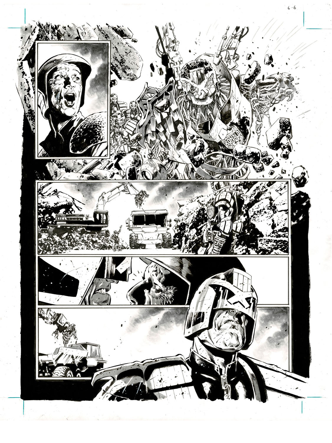 The page depicts the poignant scene in which Judge Dredd, after several years of stubbornly avoiding it, finally admits that, at least in Ronald's case, the Mech is indeed a Judge, and not "just a robot", while simultaneously demanding that Ronald's remains be respected!NOTE: This page measures approximately 14" x 17".